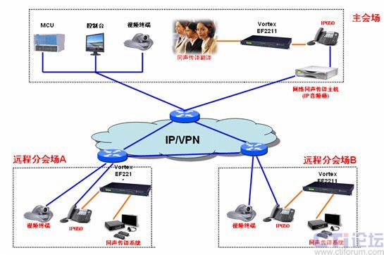 當(dāng)視頻會議召開時,主會場的翻譯既通過同聲傳譯系統(tǒng)把翻譯好的內(nèi)容傳輸?shù)奖镜氐呐c會者,也通過IP音頻會議系統(tǒng)把翻譯好的內(nèi)容傳輸?shù)竭h端的會場,遠端會場把音頻系統(tǒng)傳輸過來的聲音經(jīng)過EF2211聲音處理系統(tǒng)處理后傳輸?shù)酵晜髯g系統(tǒng),同聲傳譯系統(tǒng)把聲音經(jīng)無線耳機傳送給需要的與會者。這樣遠端會場的與會者既可以聽到主會場的原聲,也可以聽到翻譯好的內(nèi)容。相反,當(dāng)分會場發(fā)言時分會場也可以把本會場的原聲和翻譯好的內(nèi)容傳輸?shù)街鲿䦂。這樣就可以實現(xiàn)遠程同聲傳譯。能同時滿足與會的所有人員的翻譯需求,既做到翻譯內(nèi)容的統(tǒng)一,又節(jié)省了翻譯人員的人力成本。