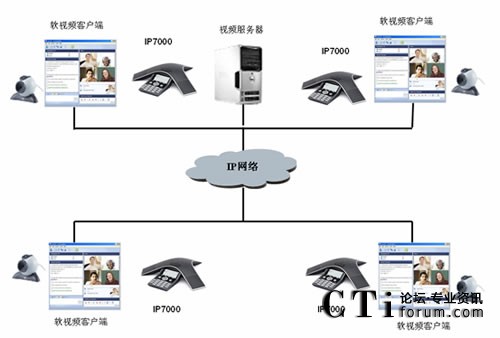 用戶現(xiàn)階段采用V2軟件視頻會(huì)議系統(tǒng),但現(xiàn)有的設(shè)備無(wú)法解決大型會(huì)議室的聲音處理問(wèn)題。故新增PolycomSoundStation IP 7000音頻會(huì)議終端,并通過(guò)Polycom專有的計(jì)算機(jī)呼叫工具包使其與PC機(jī)相連,解決V2的軟件視頻會(huì)議系統(tǒng)大型會(huì)議室的聲音處理問(wèn)題。