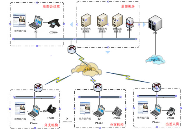 在方案的推進過程中,我們在各大會議室部署了CX3000、在桌面分別部署了CX600與IP331。通過這些終端的自身的優(yōu)勢及與系統(tǒng)的配合,實現(xiàn)了完整的電話體驗、PSTN無縫結合、LYNC完整的企業(yè)級語音功能、 高清晰語音質量 、專業(yè)的語音會議等用戶需求。現(xiàn)在此方案在鳳凰網的會議室及桌面的應用效果良好,場景應用圖如下: