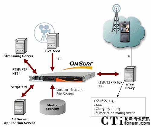 流媒體服務(wù)器(OnSurf) 使用RSTP等實時傳輸協(xié)議與客戶端進行媒體服務(wù)協(xié)商,向用戶發(fā)送媒體流,服務(wù)器同時包含語音和視頻轉(zhuǎn)碼器,用于各種音視頻媒體格式的轉(zhuǎn)換。