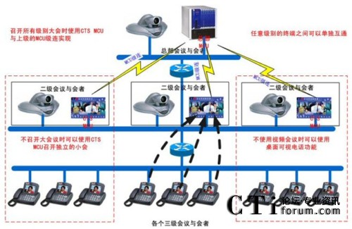 此方案由于使用了簡單而廉價(jià)的CTS軟件MCU,讓3級(jí)會(huì)議與會(huì)者接入CTS MCU,然后由CTS MCU再與上級(jí)總的MCU做級(jí)連,從而省去了在原來總部MCU端增加與會(huì)者數(shù)量許可的價(jià)格。