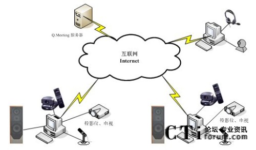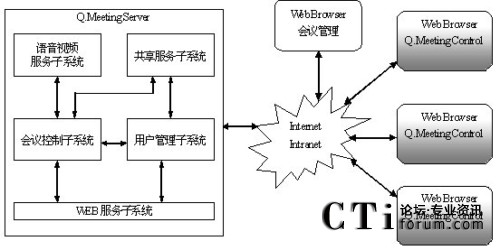 系統(tǒng)選用北京億方連線通訊技術(shù)有限公司具有國際先進水平的全新第四代網(wǎng)絡(luò)視頻協(xié)作會議中心Q.Meeting為核心進行構(gòu)建,該系統(tǒng)由會議服務(wù)器Q.Meeting Server和基于IE 瀏覽器的客戶端組成。Q.Meeting Server運行于一臺服務(wù)器上,構(gòu)成網(wǎng)絡(luò)會議中心,提供會議控制、視頻服務(wù)、語音服務(wù)、共享服務(wù)、WEB服務(wù)和會議用戶管理等功能。所有參加會議的人員只需通過IE瀏覽器訪問會議中心網(wǎng)站就可以參加會議,通過訪問會議頁面和嵌于其中的客戶端插件Q.Meeting Control實現(xiàn)音頻和數(shù)據(jù)共享等交流。