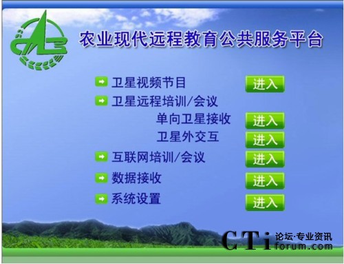 會議所使用的農(nóng)業(yè)現(xiàn)代遠程教育平臺將先進的多媒體寬帶DVB衛(wèi)星通信系統(tǒng)和全面的網(wǎng)絡遠程教育培訓/會議系統(tǒng),天(衛(wèi)星網(wǎng))地(互聯(lián)網(wǎng))合一,集成廣播、電視和網(wǎng)絡的功能,形成了廣覆蓋、大容量、多功能、低成本、快捷高效的遠程教育培訓網(wǎng)絡、技術培訓資源傳輸通道和網(wǎng)絡視頻會議系統(tǒng),是面向“三農(nóng)”開展多形式多層次現(xiàn)代遠程教育培訓、科學普及、技術推廣和信息傳播的公共服務平臺。該平臺包括:單向廣播式衛(wèi)星直播系統(tǒng)、雙向衛(wèi)星交互式培訓/會議系統(tǒng)、衛(wèi)星外交互培訓/會議系統(tǒng)(衛(wèi)星接收,互聯(lián)網(wǎng)回傳)和地面互聯(lián)網(wǎng)雙向交互培訓/會議系統(tǒng),適用于純衛(wèi)星網(wǎng)絡和衛(wèi)星網(wǎng)、互聯(lián)網(wǎng)混合接入等各種網(wǎng)絡環(huán)境。