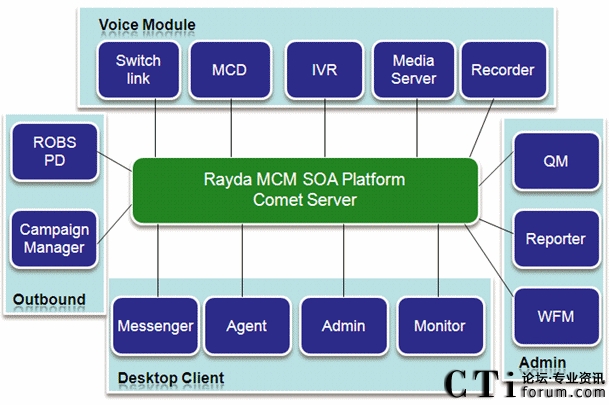 Rayda MCM多渠道呼叫管理平臺(tái),是呼叫中心基礎(chǔ)呼叫業(yè)務(wù)的信息化支撐平臺(tái)系統(tǒng)。Rayda MCM以先進(jìn)的呼叫信息交互為核心,涵蓋呼叫中心系統(tǒng)所必須的ACD、IVR、PD、錄音、質(zhì)檢等基本功能,更整合了統(tǒng)一通信、電話營(yíng)銷(xiāo)等多項(xiàng)企業(yè)迫切需要的功能。MCM支持支持從板卡、傳統(tǒng)PBX到IPPBX網(wǎng)絡(luò)等各種接入方式的建設(shè),支持從單點(diǎn)到分布式等各種組網(wǎng)方式,適應(yīng)從中小企業(yè)到外包型等各種規(guī)模呼叫中心的需求。