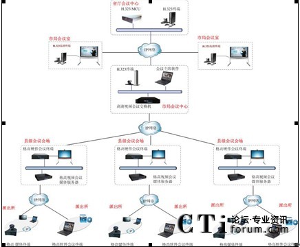 公安視頻會議系統(tǒng)建設主要依托現(xiàn)有的寬帶IP網,建設從市局到各縣區(qū)分局及各鄉(xiāng)鎮(zhèn)派出所之間的交互式視頻會議系統(tǒng),最終建成的系統(tǒng)要實現(xiàn)全省公安系統(tǒng)每個點都能互通。