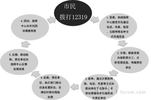 12319服務(wù)熱線系統(tǒng)具體辦事流程,劃分為以下七個(gè)階段:?jiǎn)栴}反映階段、受理階段、分理階段、任務(wù)派遣階段、處理階段、反饋階段和回訪評(píng)價(jià)階段。