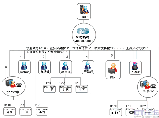 一直以來,呼叫中心座席的形式比較固定,大都通過長期坐在辦公室的人員使用PC機(jī)和電話機(jī)結(jié)合的方式進(jìn)行工作。但是,這種形式顯然不能滿足中小企業(yè)運營管理的需要,在以銷售為重的中小企業(yè)中大部分人員并不完全坐在辦公室工作,如客戶經(jīng)理、客戶服務(wù)工程師,即使坐在辦公室,也不會一直在等著接電話,如開發(fā)工程師、生產(chǎn)車間的人員等等。如何既要滿足企業(yè)運營的需要,又要實現(xiàn)呼叫的管理和分配呢?我們只需要將座席的形式簡化,將呼叫分配的目標(biāo)擴(kuò)大就可以了。手機(jī)是目前最常見和普遍的通信工具,只要我們將手機(jī)做為座席進(jìn)行管理,既不改變現(xiàn)有的組織架構(gòu),又能充分利用呼叫分配工作并對工作人員進(jìn)行管理,這將大大提高中小企業(yè)運營管理的靈活性和變通性。企業(yè)組織架構(gòu)如下: