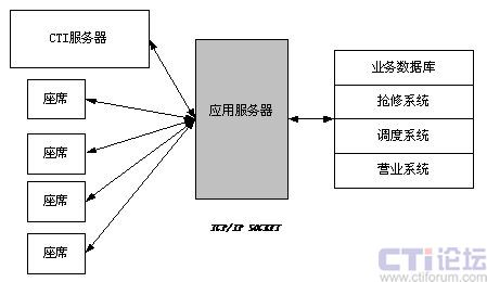 Ο數(shù)據(jù)接口采用三層C/S結(jié)構(gòu),通過構(gòu)建功能強大的應(yīng)用服務(wù)器,把呼叫中心的數(shù)據(jù)流與燃?xì)夤究蛻粝到y(tǒng)、營業(yè)系統(tǒng)、搶修系統(tǒng)和燃?xì)庹{(diào)度系統(tǒng)結(jié)合起來,充分利用了已有系統(tǒng)標(biāo)準(zhǔn)的數(shù)據(jù)接口,實現(xiàn)對后臺數(shù)據(jù)庫的訪問。如圖: