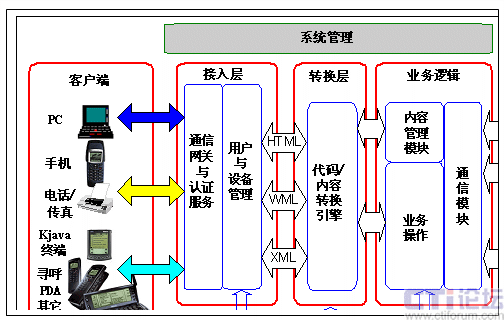 系統(tǒng)支持多種接入設備,包括廣泛使用的Web瀏覽器、支持WAP或HDML的移動電話、支持Kjava的移動終端、基于PalmOS或WinCE的PDA(個人數(shù)字助理)、傳統(tǒng)的移動電話和尋呼等,并可以方便對于未來的接入設備進行定制。