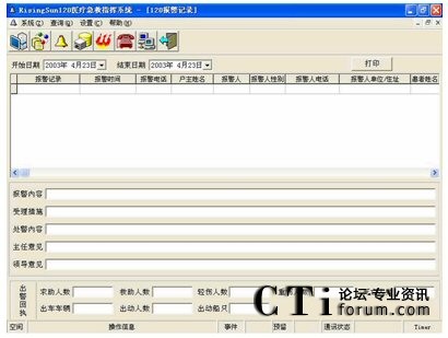 該庫記錄每個120報警被最終處理的全過程,記錄包括報警有關(guān)信息、急救措施、調(diào)度命令、涉及的有關(guān)人員等信息。每個120報警被記錄后便不允許刪除。系統(tǒng)只允許有權(quán)限的用戶進行查詢、統(tǒng)計、匯總、生成報表并打印出來。