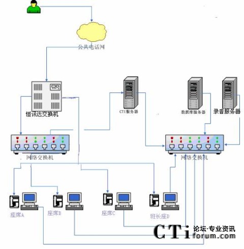 根據(jù)以上業(yè)務(wù)設(shè)計框架,我們確定了客服中心搭建時所需要的設(shè)備,系統(tǒng)的拓?fù)浣Y(jié)構(gòu)示意如下: