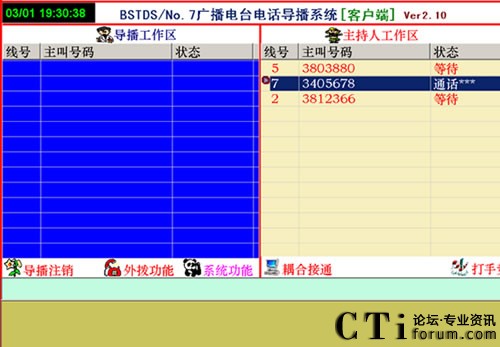 1、直播節(jié)目開播時,參與者打進電話,由導(dǎo)播把參與電話導(dǎo)入直播區(qū),這時直播區(qū)顯示參與者的電話號碼,主持人可以任意的選擇參與者進行通話或掛機。