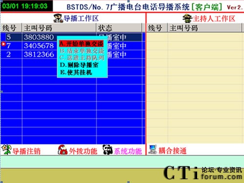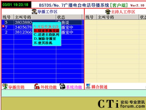 在上圖中,其中信號表示第5路、第7路、第2路分別來了3個電話,其電話號碼顯示在上面。其狀態(tài)都是在導(dǎo)播室中。這時導(dǎo)播想接通某路電話就在某路電話的上面點擊鼠標(biāo)右鍵會出現(xiàn)如下彈出示菜單: