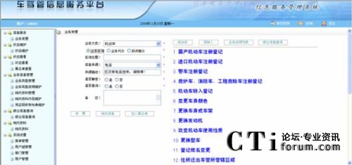 該模塊主要受理三大類(lèi)業(yè)務(wù):咨詢(xún)類(lèi)業(yè)務(wù)、代辦類(lèi)業(yè)務(wù)和投訴建議類(lèi)業(yè)務(wù),以及提供業(yè)務(wù)咨詢(xún)和業(yè)務(wù)代辦時(shí)的相關(guān)業(yè)務(wù)信息檢索和機(jī)動(dòng)車(chē)、駕駛?cè)司C合信息的查詢(xún)驗(yàn)證。