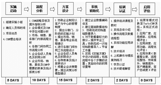 根據(jù)東風(fēng)設(shè)備廠作為傳統(tǒng)國(guó)營(yíng)制造企業(yè)的特點(diǎn),TurboCRM的實(shí)施顧問將系統(tǒng)實(shí)施分為實(shí)施啟動(dòng)(理念導(dǎo)入)、流程分析(業(yè)務(wù)梳理)、方案設(shè)計(jì)(流程固化)、系統(tǒng)初始化(系統(tǒng)部署)、培訓(xùn)認(rèn)證、啟用評(píng)估六個(gè)階段,步步推進(jìn)。