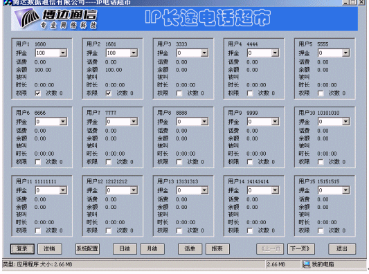 博達公司在IP電話認證的基礎上開發(fā)的IP電話計費計費系統(tǒng),實現(xiàn)了用戶管理、卡用戶批量生成、費率設置、折扣設置、話單查詢、帳務查詢、管理統(tǒng)計、運營分析等功能,為電信運營商的運營和企業(yè)用戶對IP電話的內(nèi)部管理和服務提供了有利條件。