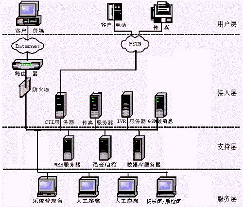 CTI服務(wù)器、IVR/FAX服務(wù)器、人工座席、管理工作站(計(jì)費(fèi)、統(tǒng)計(jì)、系統(tǒng)管理、網(wǎng)絡(luò)管理)、數(shù)據(jù)庫(kù)服務(wù)器、WWW服務(wù)器、網(wǎng)絡(luò)系統(tǒng)等,其網(wǎng)絡(luò)結(jié)構(gòu)圖如下: