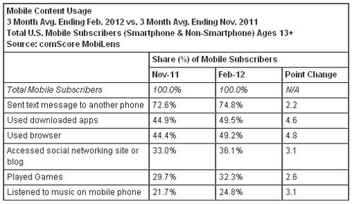 按截至今年2月份的三個月的平均數(shù)計算,美國手機用戶中有74.8%的用戶利用手機發(fā)送短信,相比截止去年11月的三個月上升2.2個百分點;有49.5%的用戶使用了下載的應用程序(上升4.6個百分點),有49.2%的用戶使用瀏覽器(上升4.8個百分點),有36.1%的用戶訪問社交網(wǎng)站或博客(上升了3.1個百分點);有32.3%有用戶利用手機玩游戲(上升2.6個百分點),有24.8%的用戶利用手機聽音樂(上升3.1個百分點)。