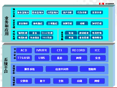 從呼叫中心的建設(shè)角度分析,系統(tǒng)將分為系統(tǒng)平臺和業(yè)務(wù)應(yīng)用2大部分: