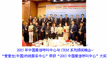 EPSON(中國)客服系統(tǒng)榮獲了"2005中國最佳呼叫中心"大獎。 由信息產(chǎn)業(yè)部中國信息化推進(jìn)聯(lián)盟客戶關(guān)系管理專業(yè)委員會、CTI論壇客戶關(guān)系管理學(xué)院共同舉辦的2005