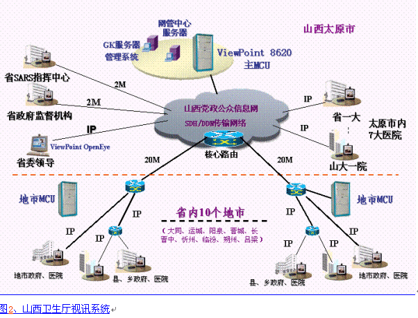 8000綜合視訊系統(tǒng),主會場設在非典防治指揮中心,利用現(xiàn)有的山西黨政公眾信息網(wǎng)絡及通信部門緊急支援的2Mbps數(shù)據(jù)專線,整個系統(tǒng)采用H.323協(xié)議,在省內(nèi)7大醫(yī)院、及省政府有關(guān)部門使用ViewPoint