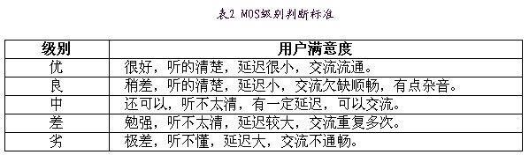 MOS(MeanOpinionScore)是一種常用的主觀評價標準。IP電話業(yè)務的MOS定義為四級:4.0-5.0(優(yōu))、3.5-4.0(良)、3.0-3.5(中)、1.5-3.0(差)、0-1.5(劣)。用戶滿意度和MOS等級的對應關系見表2。