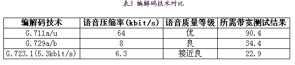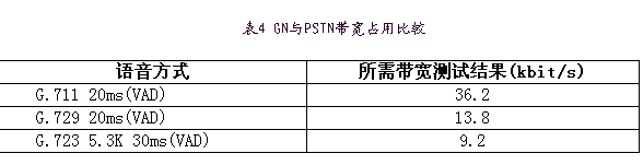 為進一步節(jié)省帶寬,又采用語音激活檢測技術(VAD)及舒適噪音生成(CNG)技術,VAD技術只有當檢測到語音處于活動狀態(tài)時,編碼器的輸出信號才被送到網(wǎng)絡上,因此節(jié)省了帶寬。而在靜音時段采用CNG技術,生成與背景噪聲相匹配的較舒適的靜音,避免了用戶有不自然的交談感覺,保證通話質(zhì)量。實際測試結果如表4,采用G.72920ms打包+VAD技術節(jié)省了近75%的帶寬。