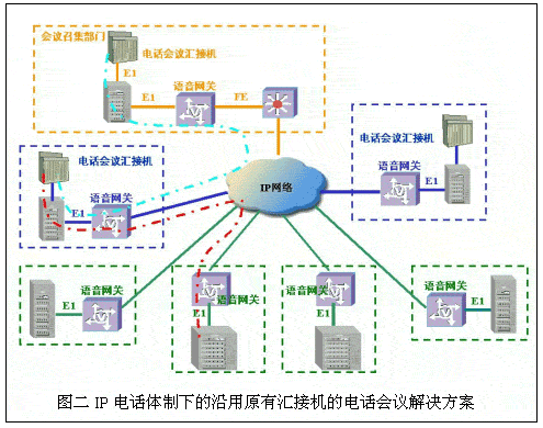 伴隨著IP網(wǎng)的建設(shè)和VoIP電話系統(tǒng)標(biāo)準(zhǔn)的日益完善,許多行業(yè)、部門開始在建設(shè)IP數(shù)據(jù)網(wǎng)的同時,結(jié)合原有電話專網(wǎng)的改造,著手建設(shè)IP電話網(wǎng)絡(luò)。在IP電話網(wǎng)上實現(xiàn)原有的電話會議業(yè)務(wù)也就隨之提到日程上來。華為公司結(jié)合IP電話的特點和保護(hù)用戶已有投資的角度,提出延用電話會議匯接機和采用華為專用IP電話會議控制系統(tǒng)兩套解決方案: