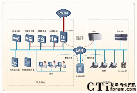客戶電話通過PSTN統(tǒng)一由華為UAP3300排隊機接入,由華為平臺的IVR服務(wù)器進行業(yè)務(wù)導(dǎo)航分流,根據(jù)用戶的選擇和IVR流程的配置進行路由,可以選擇不同平臺來處理此業(yè)務(wù)。來話根據(jù)IVR流程路由后,兩個平臺采用負荷分擔方式進行工作。在將來話導(dǎo)入兩個平臺后,采用不同設(shè)備的IVR進行業(yè)務(wù)分配,不同平臺的座席處理不同的業(yè)務(wù)。在處理過程中,不同平臺的座席之間可以互轉(zhuǎn),達到全網(wǎng)資源共享的功能。