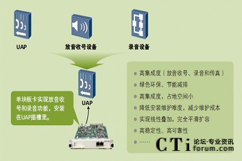 隨著全球氣候的變化,低碳經(jīng)濟(jì)已經(jīng)成為關(guān)注焦點(diǎn)。一體化接入平臺UAP2100內(nèi)置了寬窄帶語音交換和排隊功能,在僅2U的高度之內(nèi)實(shí)現(xiàn)了寬窄帶中繼接入和錄音、放音等媒體資源處理能力,無需外置媒體服務(wù)器和中繼網(wǎng)關(guān),低能耗元器件的使用和高集成度設(shè)計,有效降低了空間占用和能源消耗,使您在不經(jīng)意間就實(shí)現(xiàn)了綠色聯(lián)絡(luò)中心平臺,降低您可觀的運(yùn)行成本。