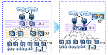 減化的網(wǎng)絡通過集群,網(wǎng)絡自動化,網(wǎng)絡智能化技術,消除網(wǎng)絡中的可靠性隱患,如STP等。把網(wǎng)絡的故障收斂時間從秒級別提高到毫秒級別。