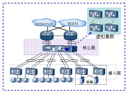 如上圖所示,整個數(shù)據(jù)中心網(wǎng)絡通過虛擬集群技術,多個核心層設備虛擬為一臺設備。通過增加核心節(jié)點,提供無阻塞的網(wǎng)絡能力,接入更多服務器。服務器的規(guī)模可以從3000臺“無級擴展”到數(shù)萬臺。在滿足企業(yè)日益增長的業(yè)務需求的同時,并不增加網(wǎng)絡的復雜度,減少管理和維護的成本。