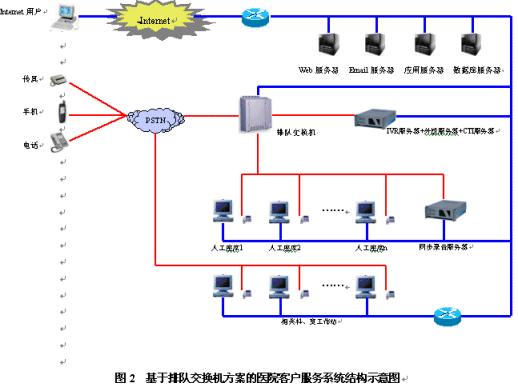 醫(yī)院客戶服務(wù)系統(tǒng)是一個(gè)集合電話語音、計(jì)算機(jī)網(wǎng)絡(luò)、數(shù)據(jù)庫等技術(shù)的綜合信息服務(wù)平臺(tái),主要由自動(dòng)語音應(yīng)答系統(tǒng)、人工座席和數(shù)據(jù)庫系統(tǒng)三部分組成。