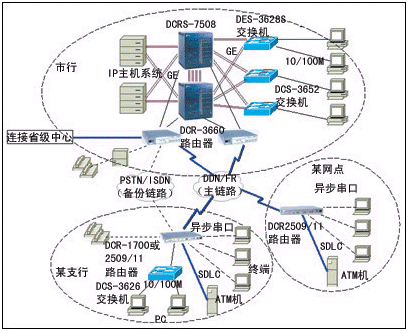 對于業(yè)務比較少的網點,使用DCR-2501或DCR-2509路由器;對于業(yè)務比較多的網點,使用DCR-2511或DCR-1720或DCR-1750路由器。營業(yè)網點使用DCR-2500或1700系列路由器,既實現柜員終端、IP業(yè)務等綜合業(yè)務接入,又能用以太口將辦公網絡連接起來,實現真正的綜合業(yè)務接入。原有遠程終端可以直接連在DCR-2500或1700系列路由器上,通過IP網絡訪問網絡內任意位置的業(yè)務前置機,無須改動原有業(yè)務軟件,輕松實現銀行綜合業(yè)務。終端通過上述路由器可訪問支行和分行不同局域網上的多臺前置機,訪問時,不需要調用前置機的TELNET服務,且終端號固定。