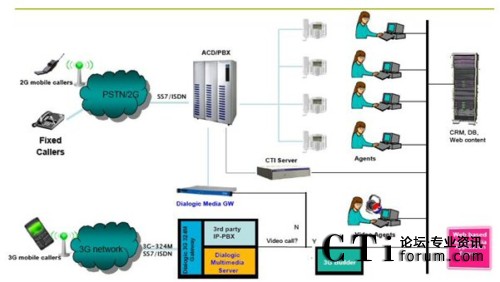 那么如何快速的實(shí)現(xiàn)3G IVVR的這些功能呢?林克海德愿意幫助您一起完成這項(xiàng)工作,基于Dialogic產(chǎn)品的全力支持,您可以實(shí)現(xiàn)web頁(yè)面到3G手機(jī)的視頻轉(zhuǎn)換,也可以與舊有的傳統(tǒng)呼叫中心(2G)互聯(lián)互通,快速建立一整套系統(tǒng)。您可以通過(guò)3G手機(jī)打到Dialogic視頻網(wǎng)關(guān),再通過(guò)3G