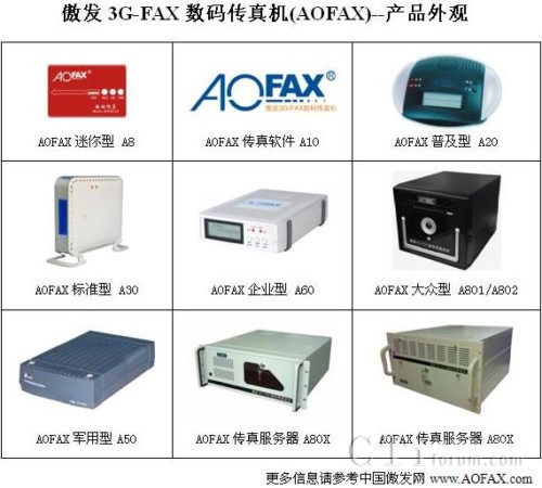 由金恒科技推出的全系列數(shù)碼傳真產(chǎn)品涵蓋了上述三個(gè)種類,上圖就是AOFAX無紙傳真產(chǎn)品系列的外形圖。其中迷你型A8和傳真軟件A10屬于第一種,普及型A20、標(biāo)準(zhǔn)型A30、軍用型A50和企業(yè)型A60屬于第二種,大眾型A801/A802和專業(yè)型傳真服務(wù)器則屬于第三種。
