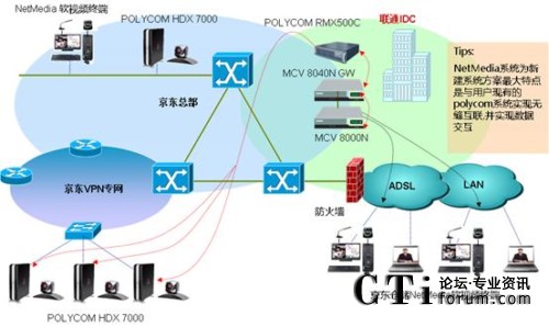 京東商城的NetMedia軟視頻會議MCU設備MCV8000N安裝在聯通的IDC,有10個倉儲的網絡視頻會議室安裝硬件終端MCV2000N,另外40個倉儲是在網絡視頻會議室的PC機上安裝一套NetMedia客戶端程序,各會議室終端通過ADSL撥號、3G無線上網、公司VPN專網等方式接入NetMedia軟視頻會議MCU。該系統(tǒng)以良好的網絡適應性運行在互聯網上,可保證音視頻低延時、高保真的交互,使各倉儲間的技術交流和庫存數據交換常態(tài)化,為各地倉儲間庫存數據交換、貨物調配提供了實時、快捷的溝通渠道。
