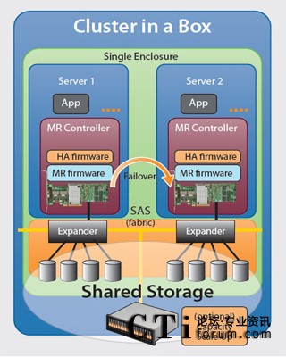 HA-DAS 解決方案,該方案包含一個(gè)布置在單一機(jī)箱中的雙服務(wù)器 3U 系統(tǒng),使用 LSI® MegaRAID® 6Gb/s