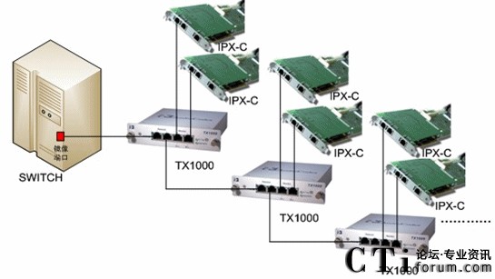 將PBX或網絡Switch的鏡像端口連接到TX1000的Network口,另一個Network口和Monitor 端口就可將一個端口的數據備份成三個端口的數據,實現了一分三的功能。若再接一個TX1000,就可以繼續(xù)分用,以此類推,根據各個IP應用中實際所需的備份/分用,TX1000都可予以實現。