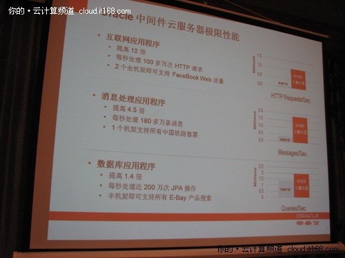 在溝通會(huì)上,喻思成用數(shù)字來告訴媒體Oracle中間件云服務(wù)器的Java應(yīng)用性能和可靠性在甲骨文進(jìn)行的內(nèi)部測試中,單機(jī)架Oracle Exalogic Elastic Cloud顯示: 互聯(lián)網(wǎng)應(yīng)用性能提高12倍,達(dá)到每秒100萬HTTP以上;消息處理應(yīng)用性能提高4.5倍,每秒能處理超過180萬條消息。