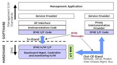 - 管理軟件:系統(tǒng)管理者最常接觸的就是上層的管理軟件,簡單的類型就是使用一般的終端機(Terminal)程序來接收從Serial/Modem所傳送過來的文字訊息。近年來,除了BMC廠商會有自行開發(fā)的上層管理軟件外,也有不少的軟件廠商加入了開發(fā)管理軟件的行列,而他們最主要利用的溝通界面即為網(wǎng)絡(luò)界面。不管是通過序列或是網(wǎng)絡(luò),在界面上傳輸?shù)亩际荁MC所能辨認的IPMI訊息。