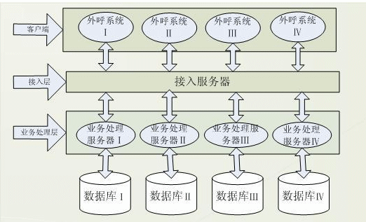 針對(duì)舊外呼業(yè)務(wù)系統(tǒng)的弊端及業(yè)務(wù)系統(tǒng)特點(diǎn),賽迪呼叫研發(fā)了基于三層C/S結(jié)構(gòu)的外呼業(yè)務(wù)系統(tǒng),該系統(tǒng)分客戶端,接入服務(wù)器,業(yè)務(wù)服務(wù)器及數(shù)據(jù)庫端。客戶端發(fā)送請(qǐng)求給分配服務(wù)器,接受到請(qǐng)求后,分配服務(wù)器根據(jù)客戶端的請(qǐng)求數(shù)據(jù)將其分配給自身的業(yè)務(wù)服務(wù)器做業(yè)務(wù)處理,這樣客戶端與業(yè)務(wù)服務(wù)器建立起聯(lián)系,結(jié)構(gòu)體系如圖: