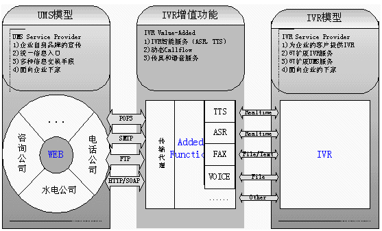傳統(tǒng)UMS的分散的網(wǎng)民,而IVR, UMS服務提供商的客戶是企業(yè),系統(tǒng)的使用者則是企業(yè)的客戶(即系統(tǒng)面向下家,由下家為最終客戶提供服務),分離的模式可以有兩個獨立的企業(yè)來運營系統(tǒng),IVR Service由具有電信資源的企業(yè)(如:具有接入號,有電信中繼資源,還有CTI系統(tǒng)建設經(jīng)驗)運營。UMS Service由ISP企業(yè),網(wǎng)站門戶企業(yè)等在互聯(lián)網(wǎng)絡有建設經(jīng)驗的企業(yè)運營。兩家企業(yè)密切合作。共同提供完善的統(tǒng)一的信息服務。
