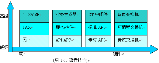 語(yǔ)言產(chǎn)品線可以用如下(圖1-1)一條技術(shù)柱心表示, 在每一個(gè)技術(shù)層面上, 國(guó)內(nèi)通信企業(yè)都有相應(yīng)的產(chǎn)品, 不同技術(shù)層面技術(shù)組合,成為一系列列產(chǎn)品解決方案.