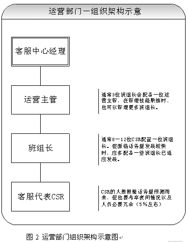 關(guān)于團隊的建設(shè),應(yīng)該首先考慮組織架構(gòu)的設(shè)立。從運營角度講,設(shè)置客服中心經(jīng)理、運營主管、班組長、客服代表都是必須的。當(dāng)然根據(jù)不同的規(guī)模,也可以增加或者減少層級。具體建議請見圖2所示。除了運營之外,對于大型呼叫中心(50坐席以上,或者業(yè)務(wù)較為復(fù)雜的),也應(yīng)考慮相關(guān)部門的設(shè)立。比如客戶關(guān)注組,可以負(fù)責(zé)疑難問題解決、工單流轉(zhuǎn)、投訴處理、建議處理、知識庫建設(shè)采編等等;培訓(xùn)組可以負(fù)責(zé)管理、組織、實施員工培訓(xùn);技術(shù)維護組可以負(fù)責(zé)系統(tǒng)維護、網(wǎng)絡(luò)維護、新項目應(yīng)用界面開發(fā)、部分系統(tǒng)優(yōu)化;綜合行政可以負(fù)責(zé)人事、行政等事務(wù)。