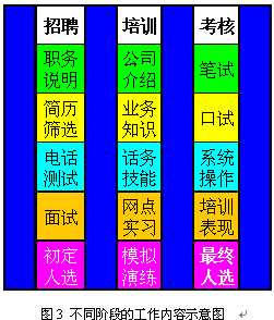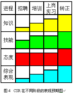 即使經(jīng)過規(guī)范的上崗培訓(xùn)與考核,新員工通常也只達到老員工70%左右的表現(xiàn)。因此制定明確的實習(xí)期,在實習(xí)期間加強指導(dǎo)和培養(yǎng)是非常重要的。通常經(jīng)過3個月的實習(xí),新員工已經(jīng)可以達到一個標(biāo)準(zhǔn),這時便可以轉(zhuǎn)正了。圖3和圖4表現(xiàn)了不同階段對CSR的不同預(yù)期,以及不同階段的主要工作。