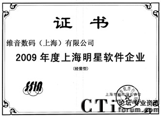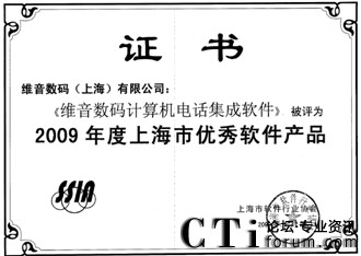 CTI論壇(ctiforum)10月19日消息: 金秋十月,捷報(bào)頻傳,由上海市軟件行業(yè)協(xié)會開展的2009年度上海明星軟件企業(yè)評選結(jié)果出爐,維音數(shù)碼不僅榮登:“2009年度上海明星軟件企業(yè)(經(jīng)營型)”和“2009年度上海明星軟件企業(yè)(創(chuàng)新型)”獲獎(jiǎng)榜單,維音數(shù)碼自主研發(fā)的軟件產(chǎn)品VisionCTI(計(jì)算機(jī)電話集成系統(tǒng))更是被評定為“2009年度上海市優(yōu)秀軟件產(chǎn)品獎(jiǎng)”。
