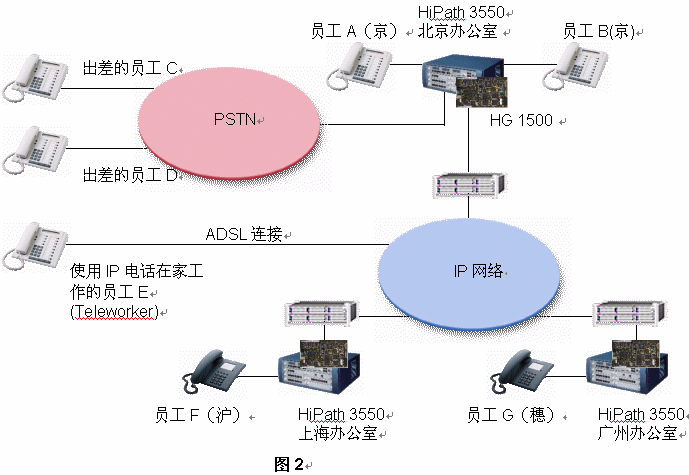 HiPath解決方案還能提供給你與企業(yè)通信平臺的獨特的遠程連接,從而使員工能夠在家或者任何遠距離的辦公室工作。中小企業(yè)的客戶特別欣賞這個主意,因為他們更傾向于雇傭家庭工作者、兼職員工、或是在遠郊設立小型的臨時辦事處。對于這些遠程工作的人員,他們只需要一臺IP話機(如optiPoint 400)以及寬帶Internet連接(見圖2),就能夠使用所有電話功能,就象他們置身于公司辦公室一樣。IP語音呼叫、電話會議、分機號碼查詢、別人還可以使用你辦公室的號碼聯(lián)系你 - 所有這一切構(gòu)成了為你定制的虛擬辦公室。