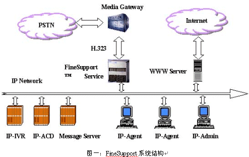 Finesupport是一個(gè)完全基于IP網(wǎng)絡(luò)的呼叫中心,不同于智能網(wǎng)應(yīng)用或CTI應(yīng)用。其應(yīng)用建立在Soft Switch體系之上,媒體流總是在第一時(shí)間被報(bào)文化,成為數(shù)據(jù)流,此后整個(gè)應(yīng)用系統(tǒng)中處理的完全是數(shù)據(jù),主要通過(guò)軟件來(lái)實(shí)現(xiàn),因而在降低成本、開展新業(yè)務(wù)、平滑升級(jí)方面具有極大的優(yōu)勢(shì)。
