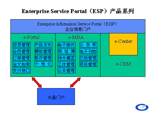 ESP 產(chǎn)品系列關(guān)系如下圖所示,EISP 是瑞尊公司所有應(yīng)用軟件的前端統(tǒng)一界面,e-Portal 、e-MBA 、e-CRM 為在EISP 平臺下運行的具體應(yīng)用系統(tǒng),e-Portal 、e-MBA 兩個產(chǎn)品合二為一構(gòu)成了針對中小企業(yè)的普及型產(chǎn)品水晶門戶。